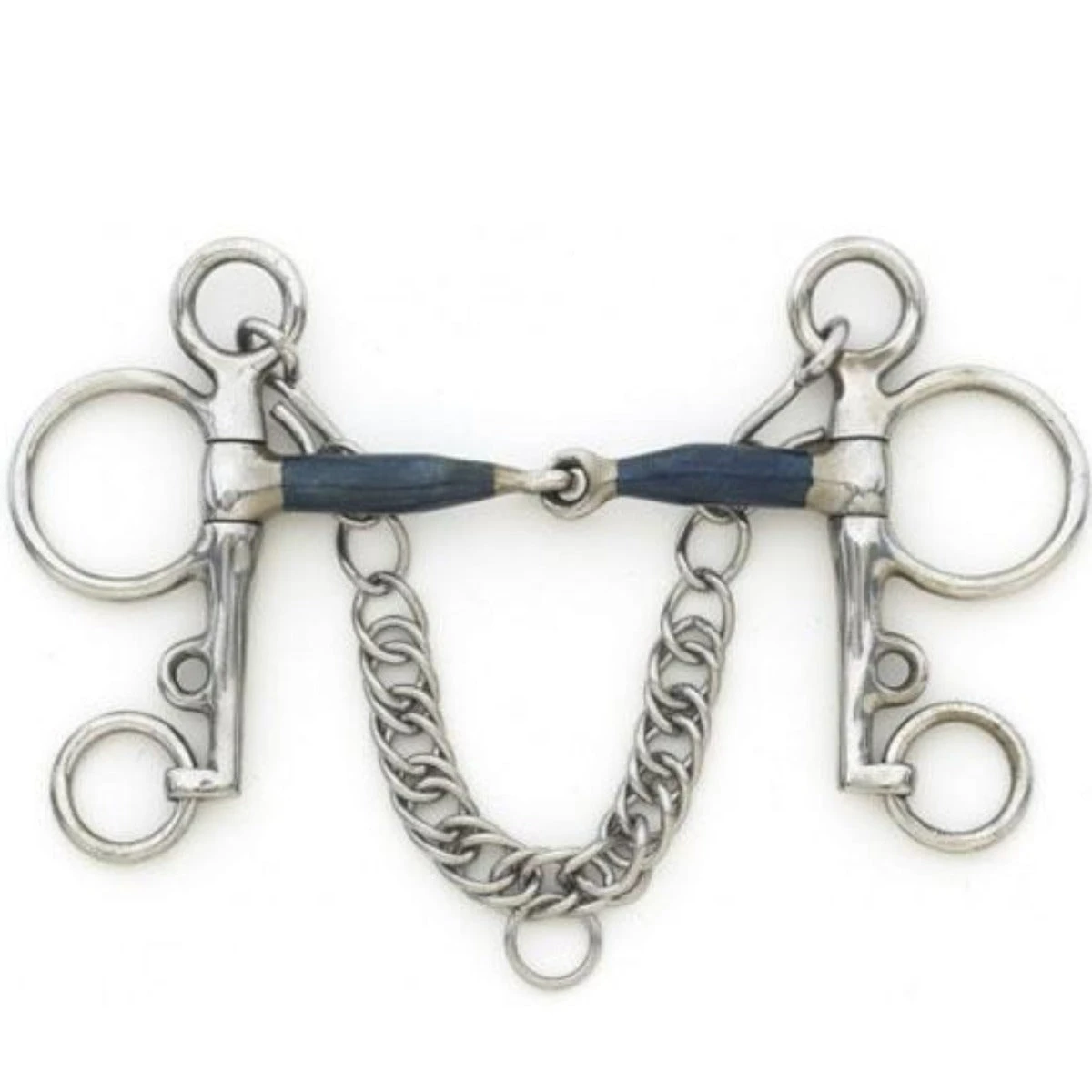 We love this Centaur® Blue Steel Jointed Tom Thumb Pelham Bit because it combines the action of a snaffle bit with a curb bit. The perfect bit if you have a horse that leans on the bit or is hard to stop. This bit requires an expert hand.