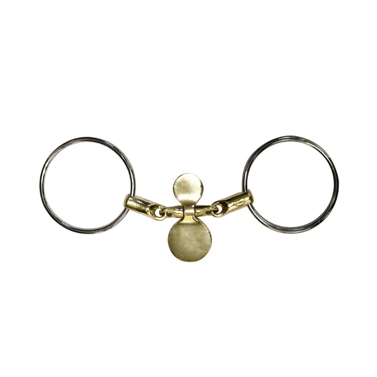 Composed of a German Silver alloy that encourages natural salivation, this loose ring features a 360° pivoting large double disk that lays flat on the tongue at all times so it can prevent the tongue from ever going above the bit