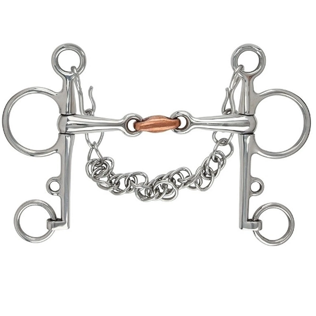 With a stainless steel mouthpiece, this bit is durable, easy to clean, tasteless, and does not rust. The addition of a copper link creates warmth and encourages salivation for a soft mouth. A more severe bit with additional control, this bit puts pressure on the bars, the poll, and the chin grove.