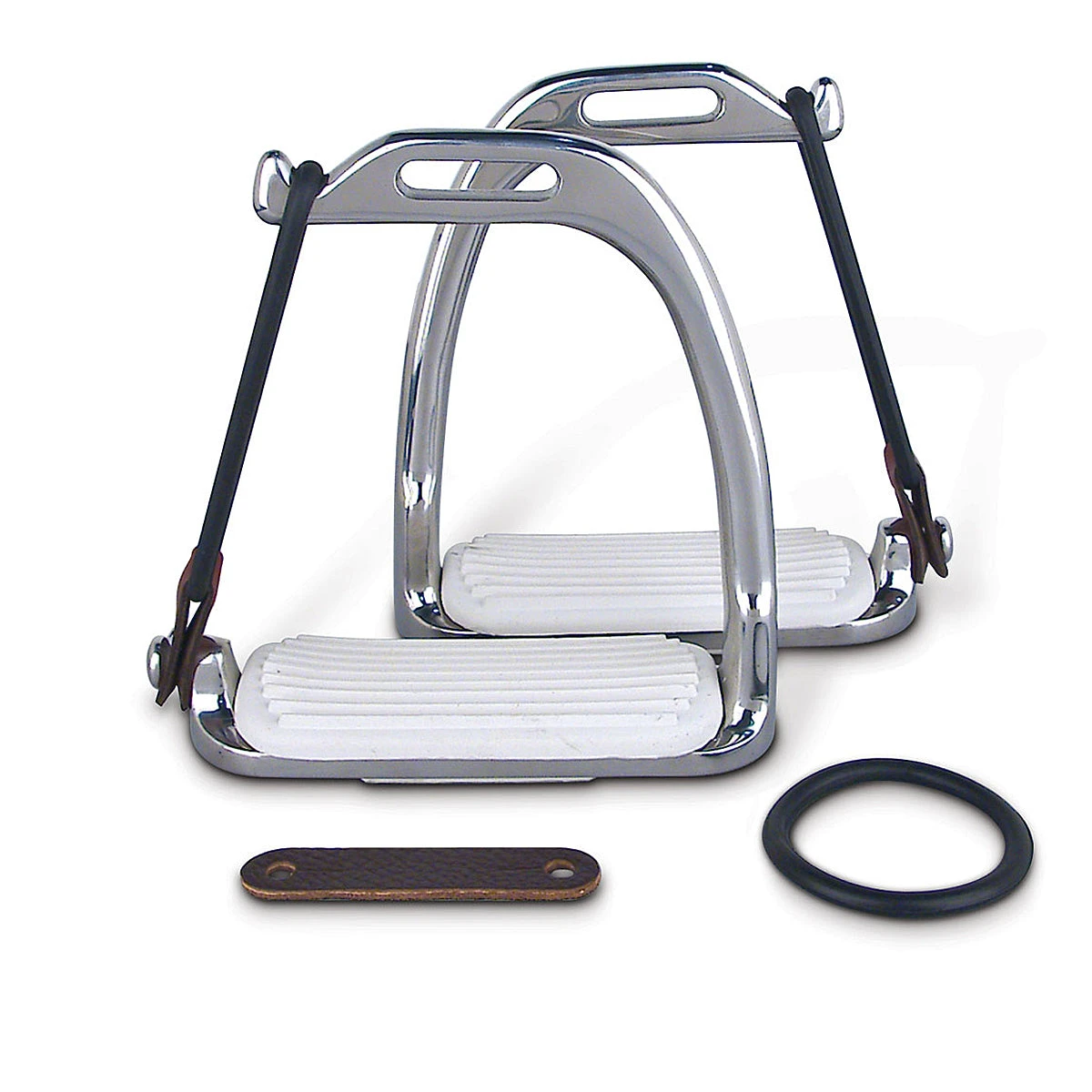 Peacock Fillis Safety Irons feature a rubber band and leather strap to release the foot in the event of a fall.
