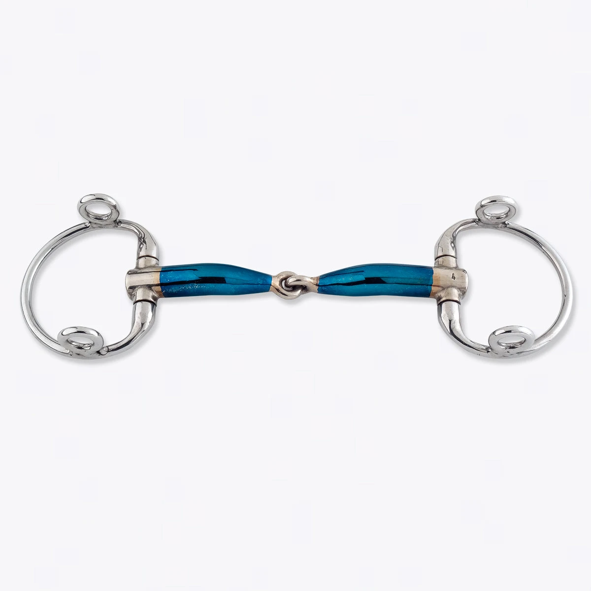 The Eggbut gag stimulates the horse to bring its head up. It is often used with horses that run behind the bit and don’t follow the hand as much as necessary. The bit can be used with one or two reins or with pelham straps. In most cases, the bit is used with two reins, one is normally attached to the bit and the other rein to the end of the gag straps.